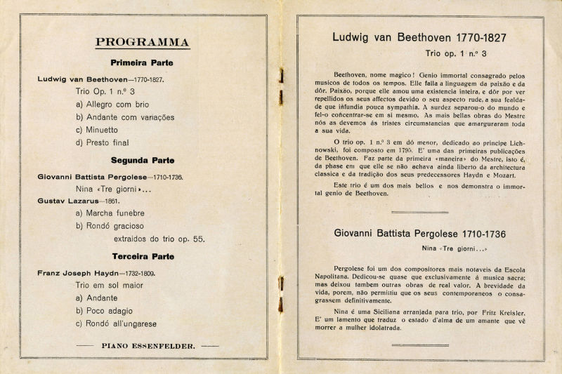 A primeira apresentação teve cerca de 50 minutos e foi dividida em três partes com dois intervalos. A primeira música daquele programa foi o “Piano Trio Opus 1, n. 3 em dó menor”, de Ludwig van Beethoven. A música de câmara em Curitiba assim, naquela noite, ganhava um novo padrão.